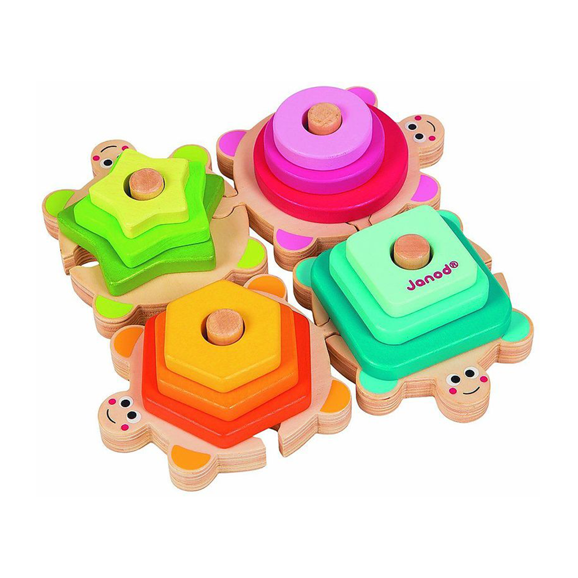 Ces tortues attendrissantes en bois de la marque Janod s’emboîtent les unes aux autres comme un puzzle. L’enfant doit reconstituer leurs carapaces excentriques, en empilant les formes colorées sur leurs dos : étoiles, hexagones, carrés et anneaux. Ce jeu de forme mignon est parfait pour développer l’adresse, la concentration et la capacité de réflexion de vos enfants de 1 à 3 ans. Les tortues et leurs accessoires sont faits en bois et peints à la peinture à l’eau ; des matériaux ne présentant aucun risque pour la santé des enfants.