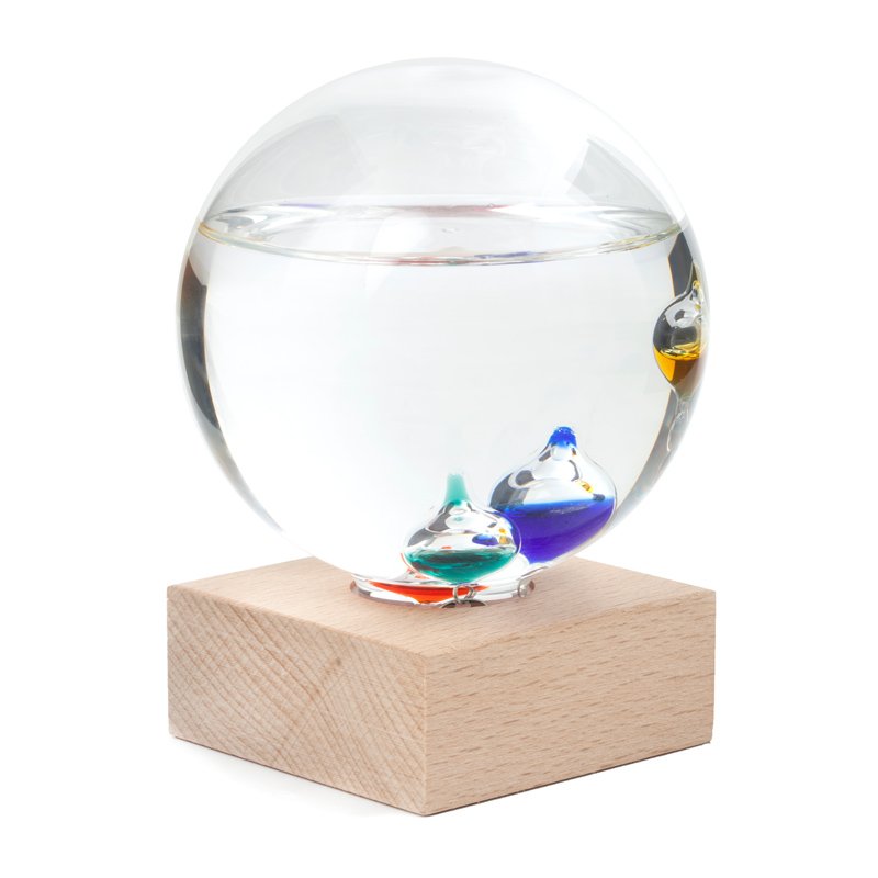 Cet objet fascinant est une merveilleuse idée déco pour le salon ou le bureau. Le thermomètre de Galilée est constitué d’une sphère en verre scellée contenant un liquide transparent et une série de bulbes remplis de fluides colorés qui montent et descendent en fonction de la température ambiante. Un pendentif avec un nombre est accroché à chaque bulbe. Les bulbes qui flottent indiquent la température actuelle dans la pièce. Le thermomètre de Galilée mesure des températures entre 16 et 28°.