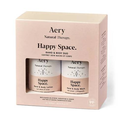 Accorde-toi un moment de détente avec le set Happy Space Hand & Body Wash and Lotion de Aery Living. L’alliance d’un nettoyage doux et d’une hydratation nourrissante diffuse un parfum chaleureux de rose, géranium et ambre – parfait pour ta salle de bain ou comme cadeau élégant.