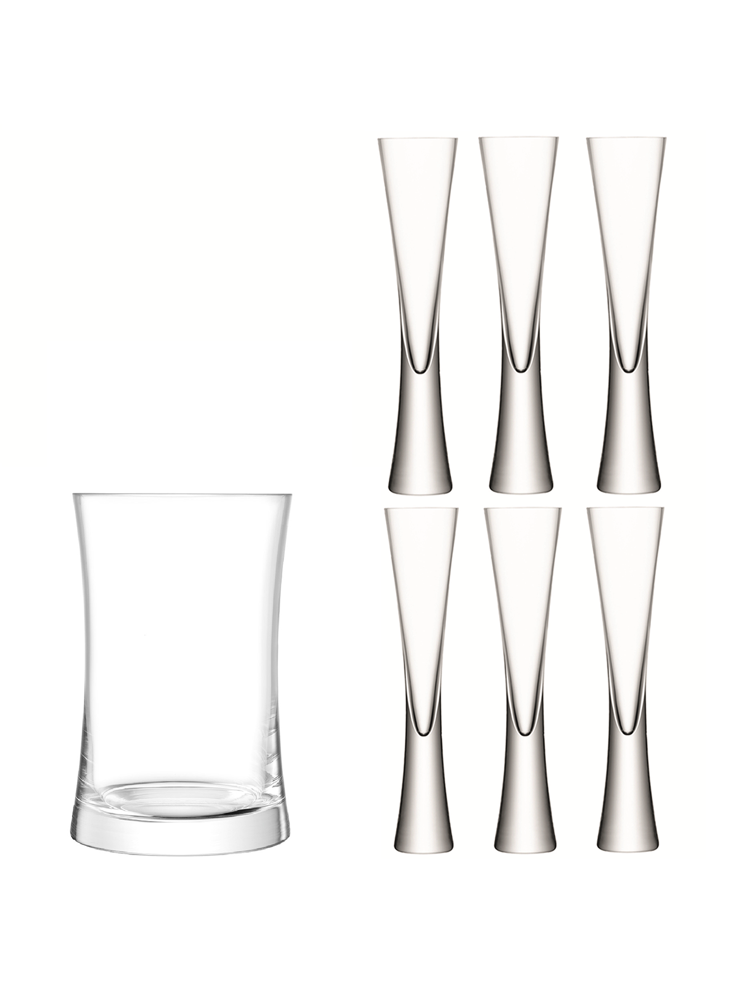 Ce set de verres est un ensemble de service à champagne en verre soufflé bouche. Le bol fin et le pied épais et évasé de chaque flûte sont soufflés à la bouche comme un seul morceau de verre. Le seau à glace présente un design courbé complémentaire, des parois épaisses et un fond lourd pour un stockage sécurisé.