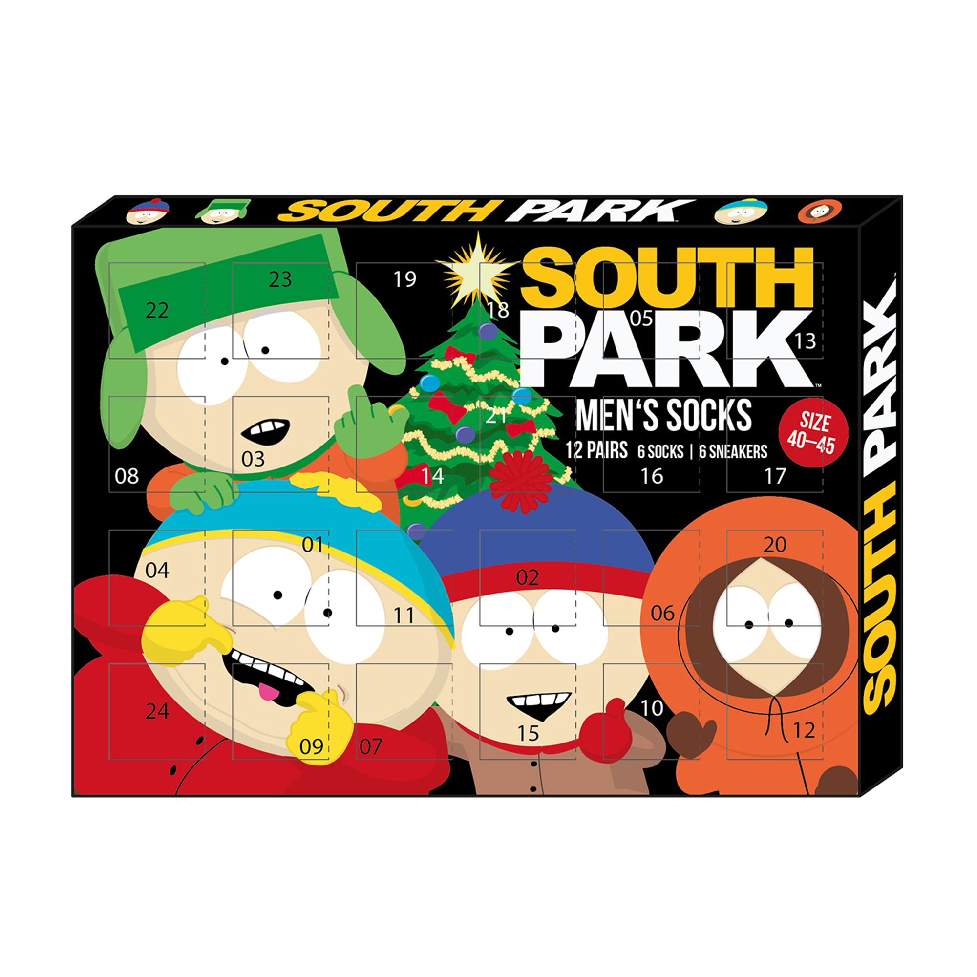 Célébrez les fêtes de fin d' année avec le calendrier de l'Avent de South Park pour les chaussettes de taille 40-45 ! Derrière les 12 portes, des motifs amusants et cultes de Cartman, Stan, Kyle, Kenny et autres t'attendent pour te faire patienter jusqu'à Noël. Le calendrier contient six paires de chaussettes de baskets et six chaussettes classiques, toutes avec des motifs humoristiques de South Park, qui égayeront ta garde-robe de manière variée et amusante.
