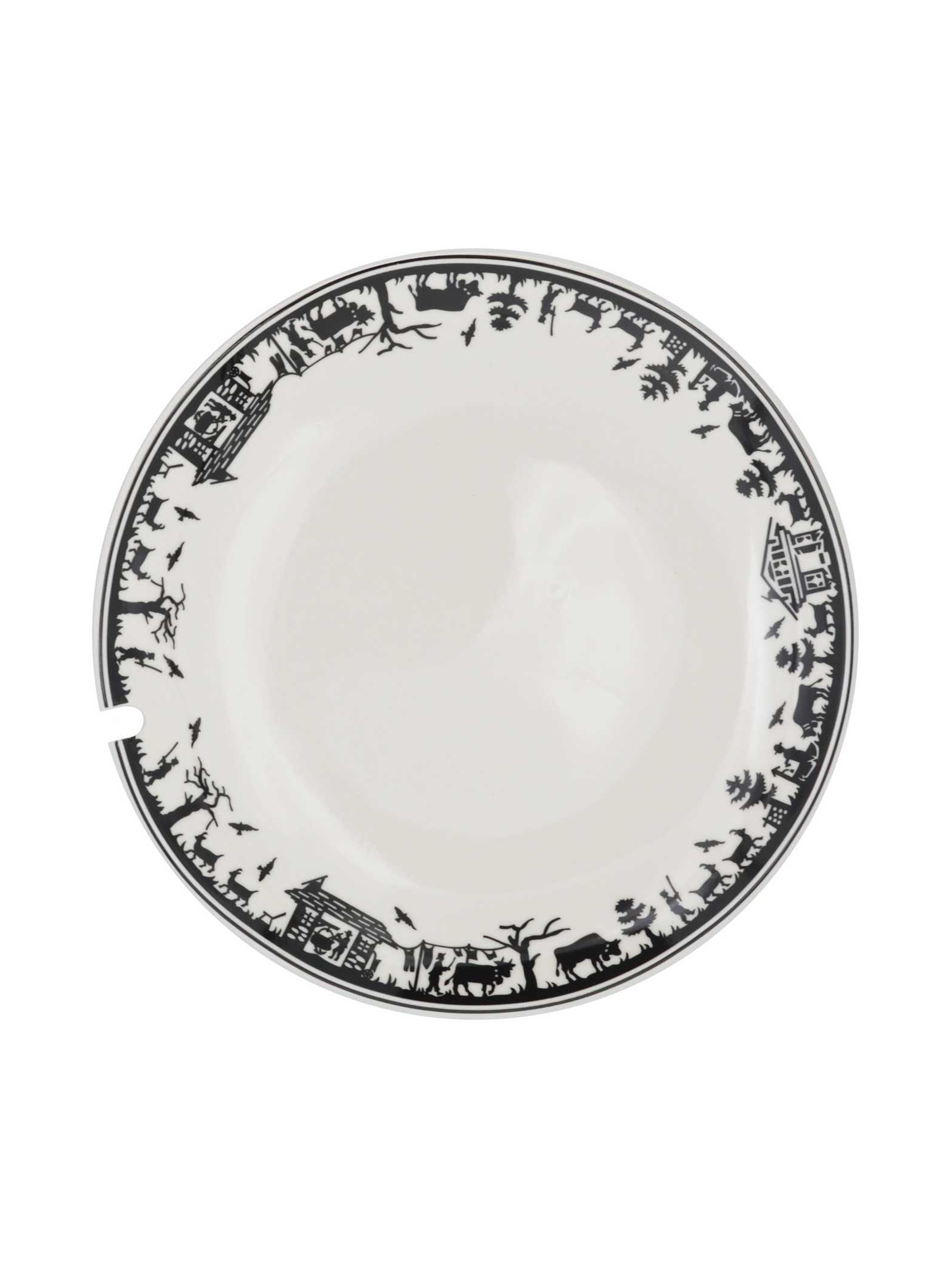 - Les personnages imprimés, qui représentent une scène de la poya traditionnelle suisse, font le tour de l'assiette et se trouvent sur un fond blanc.