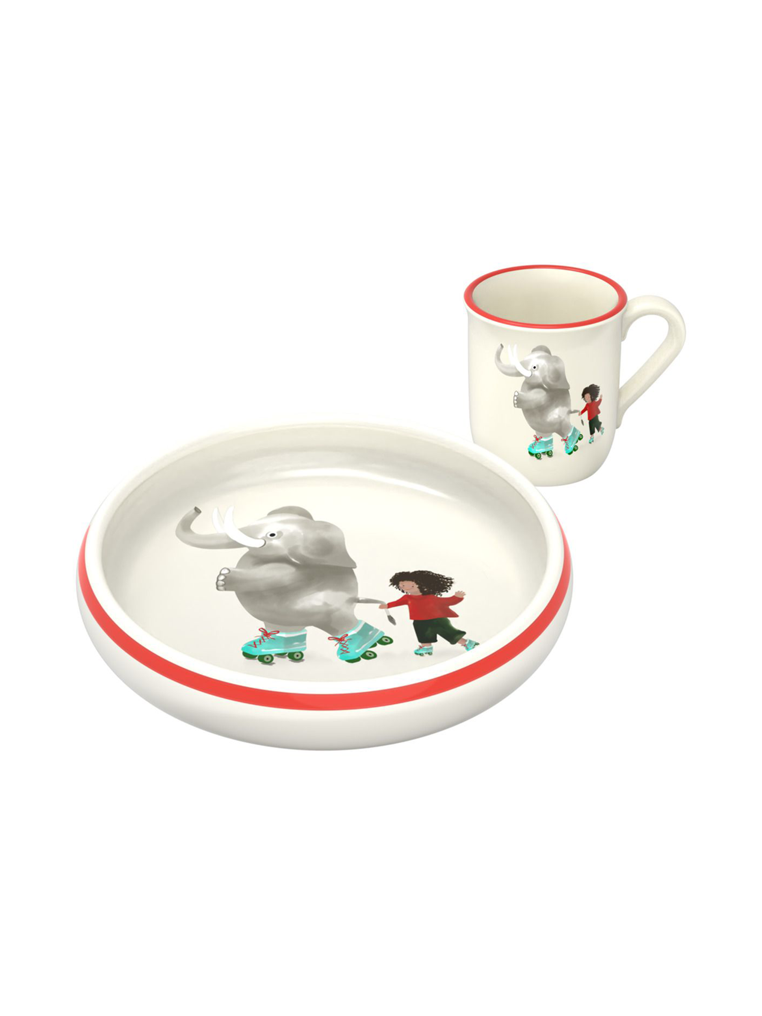 Avec ce set composé d'une assiette et d'une tasse, conçu avec amour, tu prends le temps d'admirer les petites merveilles du quotidien. L'enfant sur la grande tortue t'invite à t'arrêter, à t'étonner et à voir le monde avec des yeux curieux. Selon la devise : tu n'es jamais seul.