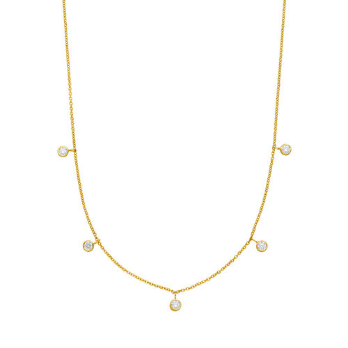 Ce délicat collier en or jaune 14 carats présente cinq diamants finement sertis, suspendus à de petites attaches le long de la chaîne. Les pendentifs de diamant mobiles apportent une légèreté ludique au bijou et créent des accents scintillants à chaque mouvement. Le design intemporel fait de ce collier un compagnon polyvalent, idéal pour le quotidien comme pour les occasions spéciales.