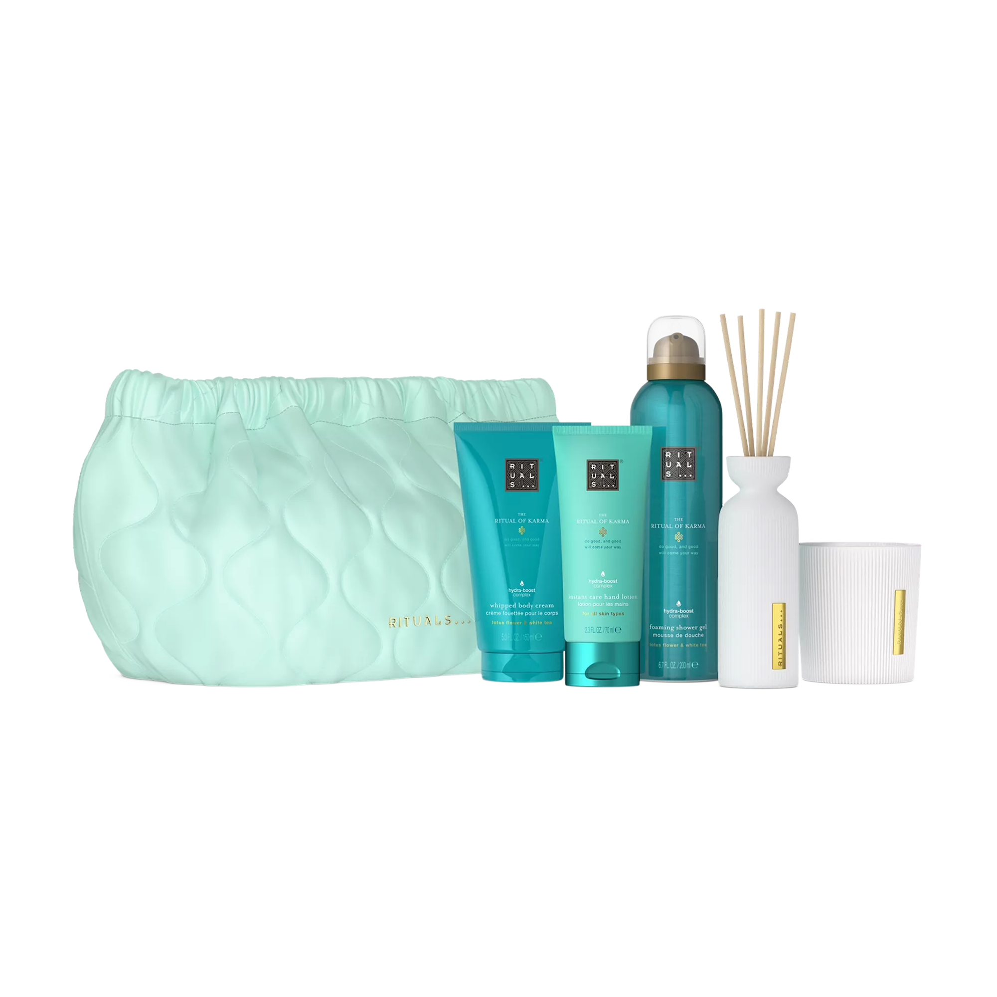 Le set de Noël Karma Large de Rituals est le cadeau idéal pour tes amis, ta famille ou pour toi-même ! Profite toute l'année de l'ultime sensation estivale avec ces produits apaisants à base de fleur de lotus et de thé blanc. La mousse de douche et la crème pour le corps contiennent notre Hydra-Boost Complex, qui reconstitue les réserves d'hydratation de ta peau grâce aux propriétés hydratantes intenses de l'aloe vera, du squalane et des algues. Cette trousse est parfaite comme trousse de toilette en voyage ou comme pochette stylée pour ajouter une touche d'élégance à ta tenue.