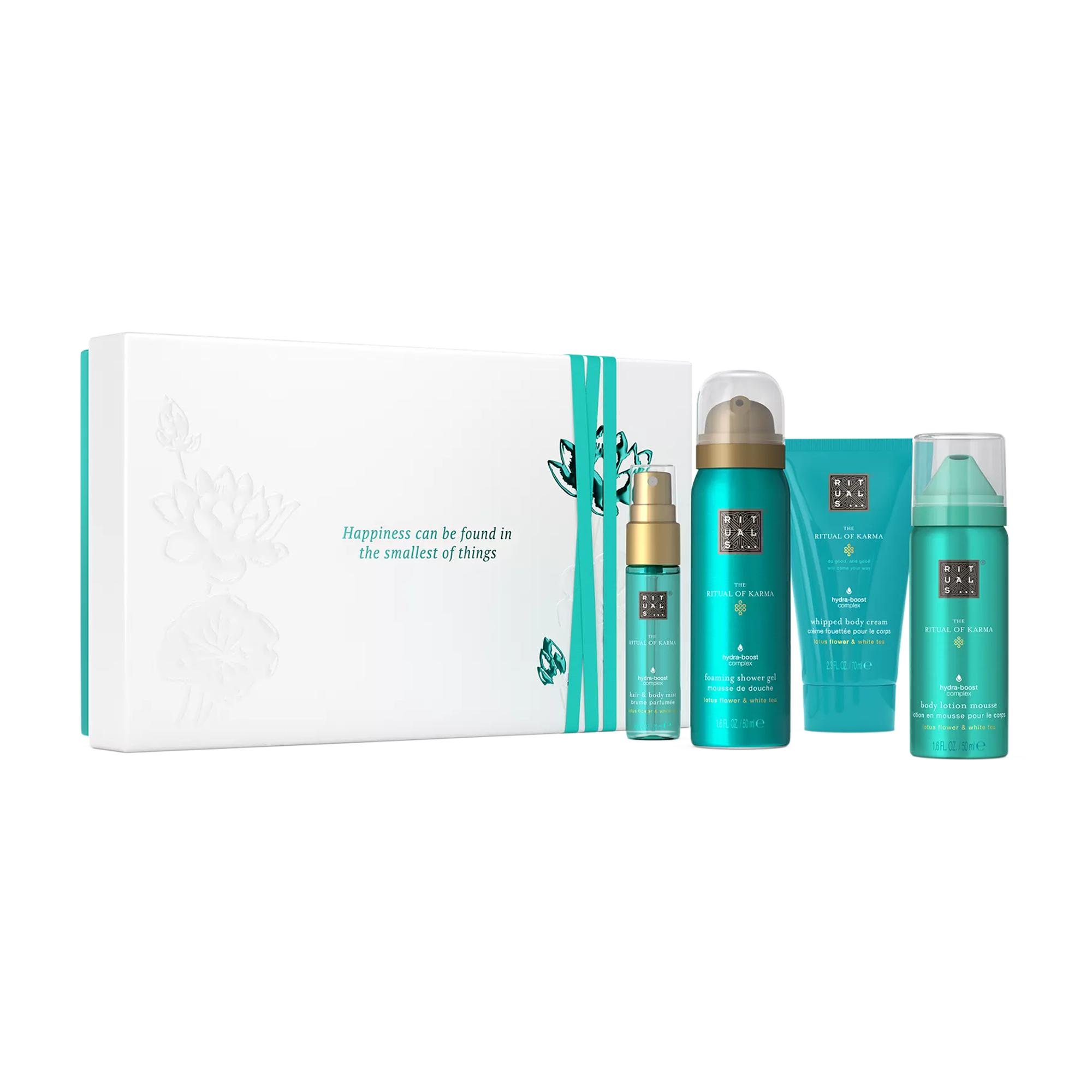 Découvre cet élégant set de Noël Rituals Karma Small, parfait pour t'offrir une petite pause ou pour faire plaisir à quelqu'un de spécial. Les produits de soin à base de fleur de lotus et de thé blanc diffusent une sensation estivale rafraîchissante tout au long de l'année. Grâce au complexe Hydra-Boost, qui contient de l'aloe vera, du squalane et des algues, tu ressens immédiatement l'hydratation intense de ta peau. Après utilisation, tu peux utiliser l'élégante boîte cadeau pour ranger tes affaires préférées.