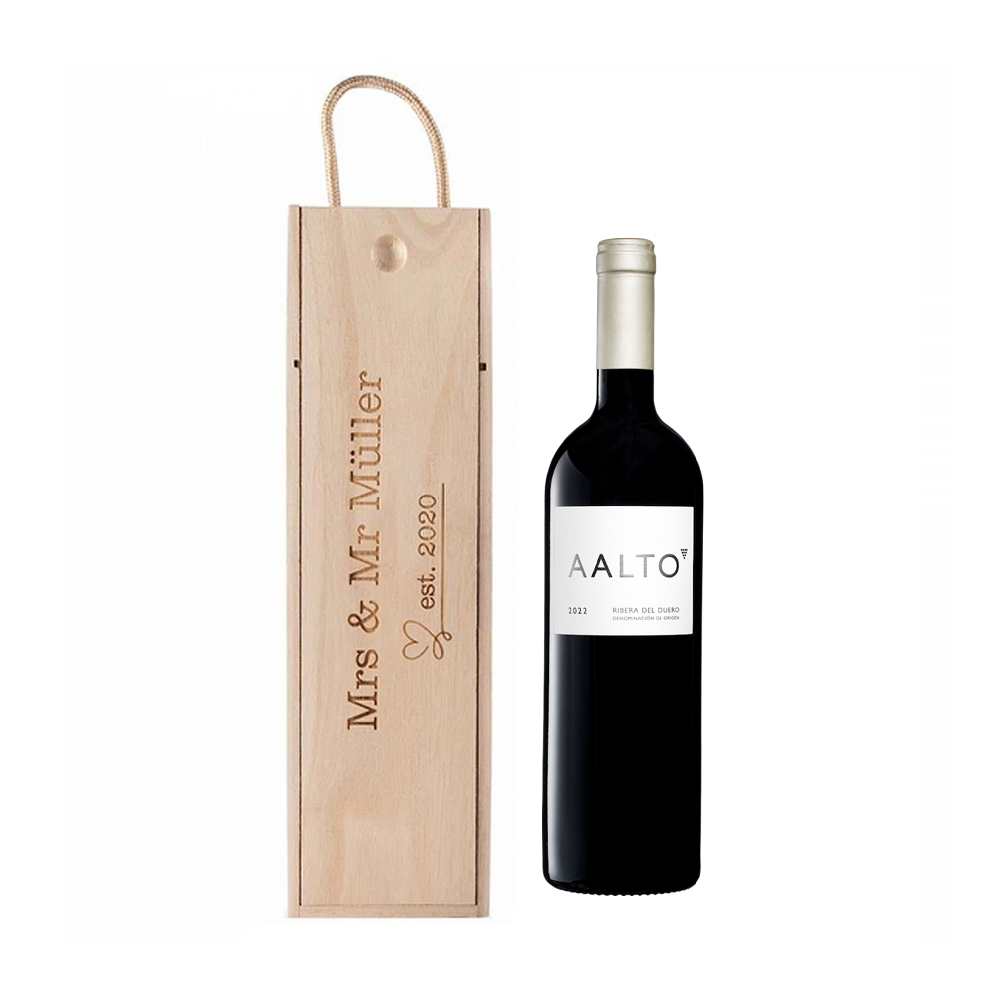 Offre un moment de plaisir particulier avec la caisse de vin personnalisable et l'Aalto 2021 de la célèbre région Ribera del Duero. Ce vin rouge puissant enthousiasme par son arôme intense de fruits mûrs, ses notes boisées épicées et un soupçon de tabac. En bouche, il se montre harmonieux, élégant et parfaitement structuré - un vrai régal. La boîte en bois de qualité supérieure, que tu peux personnaliser avec une gravure, fait de ce coffret un cadeau unique pour toutes les occasions. Coffret cadeau en bois personnalisable : Matériau : bois de paulownia, naturel Dimensions : 10 x 10 x 35 cm (dimensions intérieures : 8.5 x 8.5 x 33.5 cm) Caractéristiques : Gravure individuelle et finition élégante Remarque : le bois étant un matériau naturel, des différences de couleur et de structure peuvent apparaître Aalto 2021 Vin rouge, 75 cl : Note de dégustation : arômes fruités de baies mûres, complétés par des notes épicées de bois et de tabac. Élégant, large et avec une fine trame tannique Goût : sec Texture : puissante, équilibrée et complexe Cépages : 100 % Tempranillo (Tinto Fino) Origine : Espagne, Ribera del Duero (DO/MO) Teneur en alcool : 14,5 % vol.
